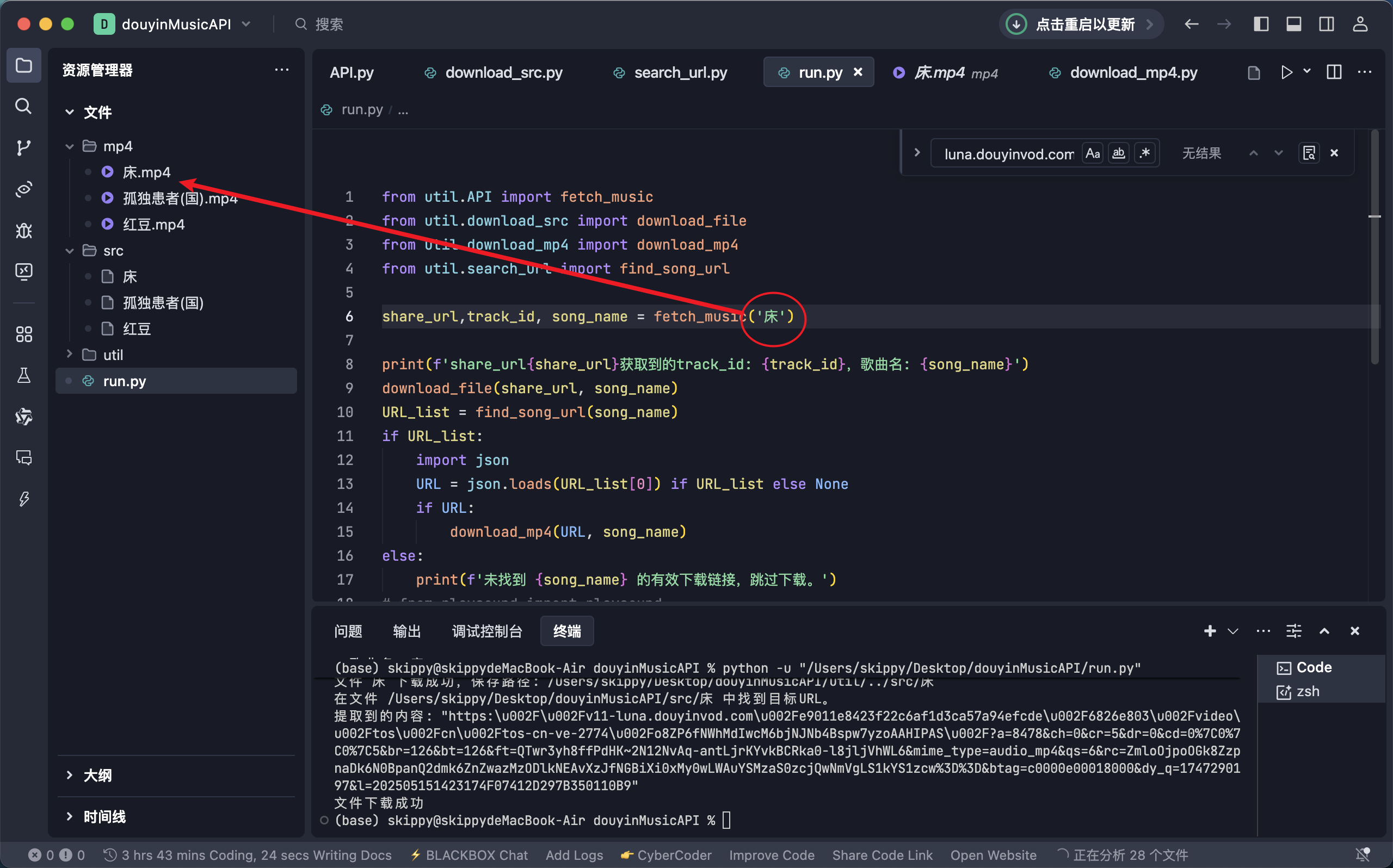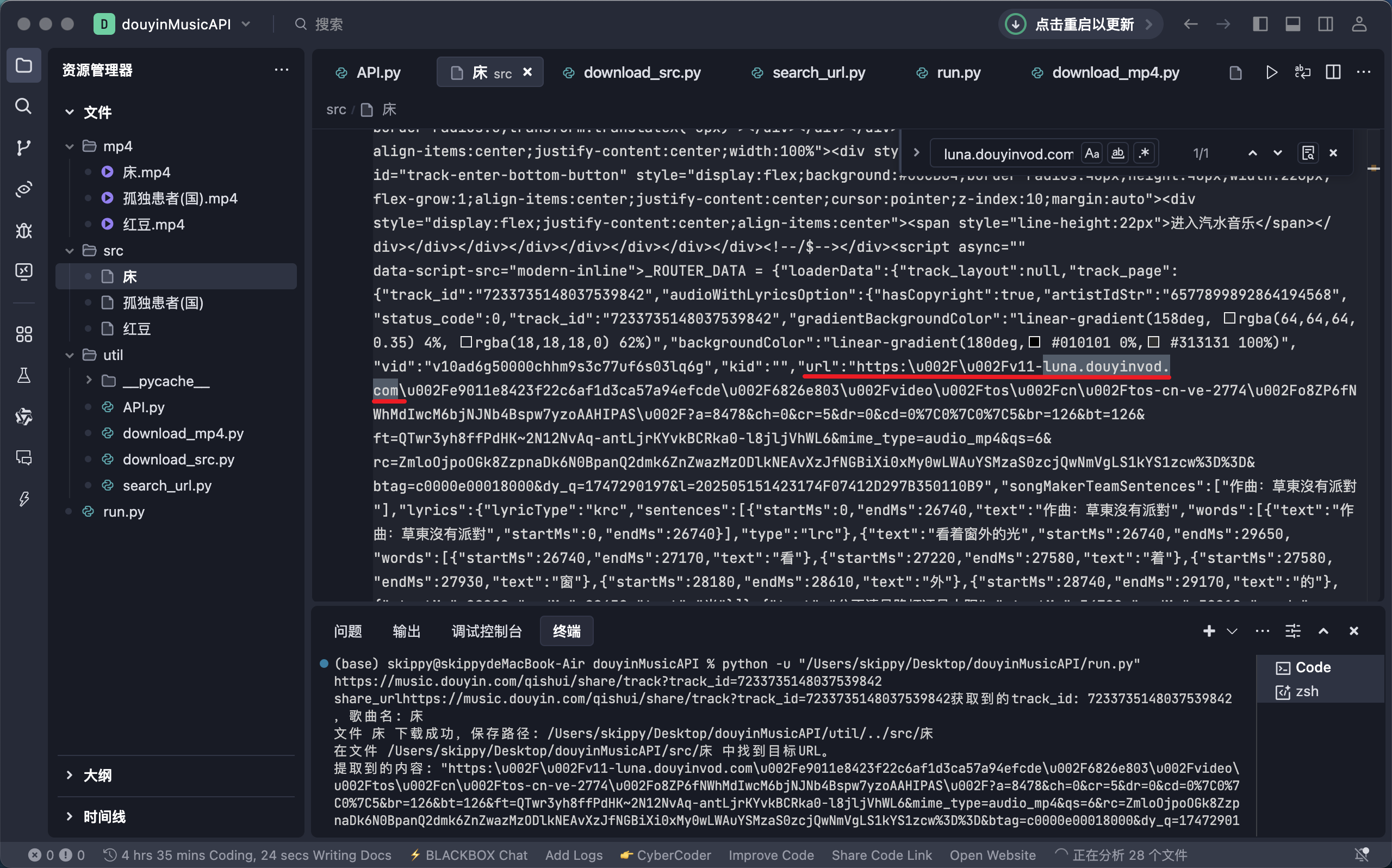 所以我只需要,把这个页面的文件下载下来,在 IDE 中搜索 luna.douyinvod.com 这个关键字段 ,确实存在这个媒体的加载地址,只需要在本地发送网络请求下载就好了。