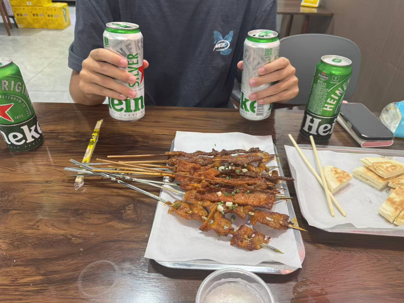 离开济南,whx 说自己实习无聊,于是我又跟着他在成都待了些日子。这是一座极度松弛的城市,他又是一个极度松弛的人,生活自然变得松弛了下来——或者说,是无所事事。他后来干脆也不好好去实习了,多数时间我们都在躺着吹空调或者在他学校里打篮球。能称得上是活动的,就是晚上经常会去他学校对面的烧烤店点上些烤串,然后在烧烤店斜对面的罗森买上四瓶「第二瓶一元」的啤酒。四瓶喜力,足以让我俩沉浸在夜色中。